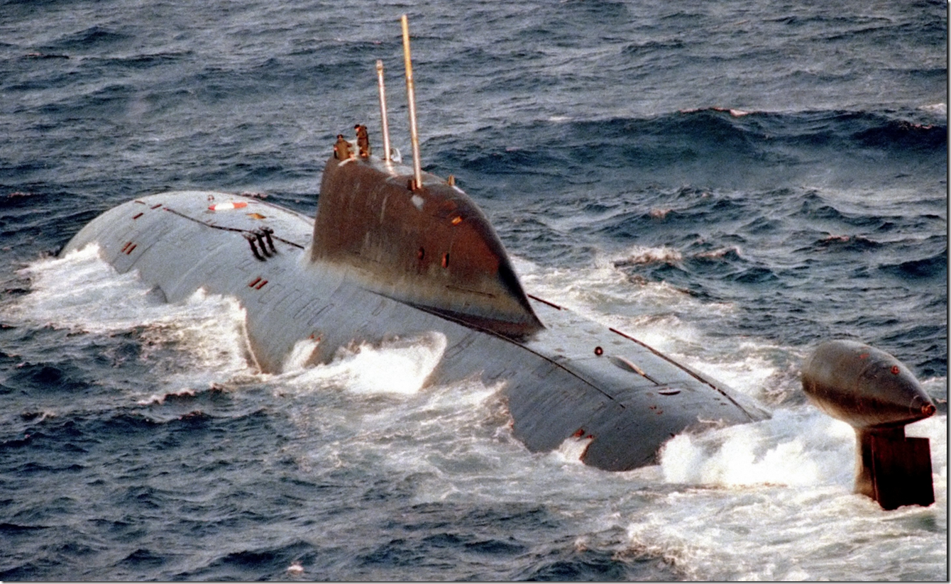 1 January 1994,K-322 Cachalot, Akula class submarine underway. A port quarter aerial view of the Russian Northern Fleet AKULA class nuclear-powered attack submarine underway on the surface.