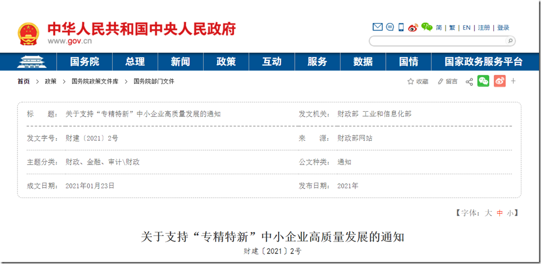 为深入贯彻习近平总书记在中央财经委员会第五次会议上关于“培育一批‘专精特新’中小企业”的重要指示精神,落实党的十九届五中全会提出“支持创新型中小微企业成长为创新重要发源地”、《政府工作报告》和国务院促进中小企业发展工作领导小组工作部署,在“十四五”时期进一步提升中小企业专业化能力和水平,财政部、工业和信息化部(统称两部门)通过中央财政资金进一步支持中小企业“专精特新”发展。