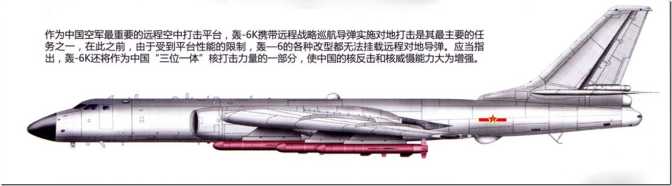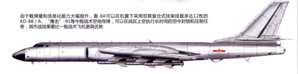 轰6K:2007年,互联网上出现轰-6的新改进首架原型机的照片,机身印有“战神”001的字样。随后这种新型轰6K就被冠以战神的绰号。轰六K研制的目标要求就是改变轰六中程航程的短腿老毛病,换装了D-30KP-2涡扇发动机,并且对进气道做了修改。使得轰六航程增加了30%,油耗少了20%。机身虽然没有改动,但是增加了机翼下方的挂点。换装了全新的火控雷达,与搜索雷达,可以挂在6枚长剑10,最大射程达1500公里。2011年轰6K正式装备部队,随后伴随着中国空军远海训练越来越密集,轰6K编队多次携带巡航导弹飞越第一岛链,每一次都会令日本倍感紧张。由于轰6K的主要使命的作为巡航导弹的发射平台,其本身就有超过3000公里的作战半径,再加上其搭载的长剑10巡航导弹1500的射程,轰6K的打击范围已经覆盖关岛,一架轰6就可搭载6枚长剑10,如果一次出动10架以上,就能对美国第一和第二岛链上的所有重要海空军基地发动饱和攻击。