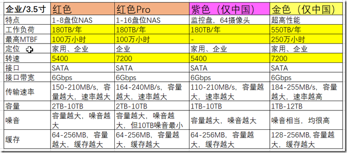 比较了一下,辨识度不是很高,还有2种是针对中国市场的。不考虑容量,用户关注度较高的指标应该是工作负荷、缓存和MTBF,从比较看,金色和红色/紫色是相对较好的。保修期也有差别,明白这些,对一分钱一分货的理解会更深刻一些。