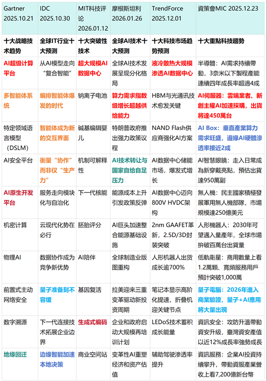 很多研究和咨询机构都发布了2026年的十大战略技术趋势,没有意外,主角肯定是人工智能,那么到底是那些人工智能呢,还有什么值得关注的地方,我们来全面研究一下。选择了常见的6个机构:Gartner、IDC、MIT科技评论、摩根斯坦利、TrendForce和资策会,这些机构的预测领域并不完全一样,有的是IT,有的是全领域,但都是科技领域的预测。初步看了一下,71%的预测都涉及到AI。我用下表列出来这些预测,用同样的粗体字来表示相近的预测。我们可以看到有很多相似的预测和有些规律的预测