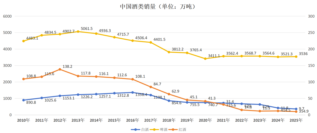 之前碰巧看到互联网上有数据,但是看着不直观,就用点线图绘制了一个曲线,如下。需要注意其中红酒的销量是最低的,因此研究了一下,图表可以采用左右不同的坐标值,也算是学到了一个新技能。这里面可以看到虽然整体趋势是下降,但是也分了几个阶段。包括2012年、2013年、2018年、2020年、2022年等等,为什么是这几个年份呢,问了一下现在流行的AI工具,就一清二楚了: