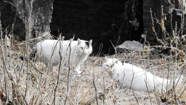 临走还是想再回去看看有没有猫,然后就惊喜地发现一只猫的身影跑过,走到近处一看,单边和双蓝眼都在下面,然后就召唤他们。差不多一年没来了,他们对我们确实有些陌生,记得曾经有人说过,猫只有3天的记忆力!!召唤了好一会儿,猫粮罐子特有的声音终于唤醒了单边的回忆,屁颠屁颠准备上坡吃好的;双蓝眼则不敢上来,于是分别给他们放了妙鲜包,两只猫一个在山坡上,一个在山坡下吃好的。一只喜鹊飞过来准备吃剩的:)
