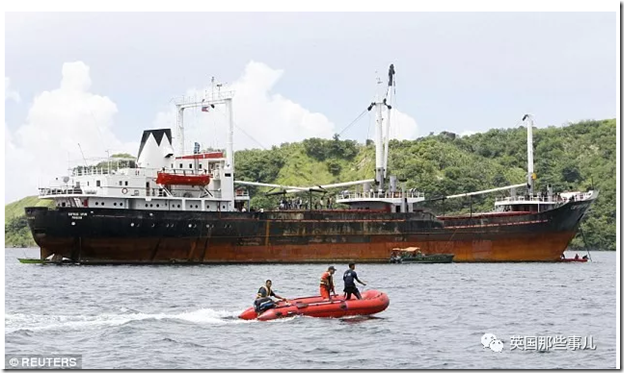 这艘船身锈迹斑斑,已经下锚的船只没有挂国旗,只是在船身上有漆上了巴拿马几个字….