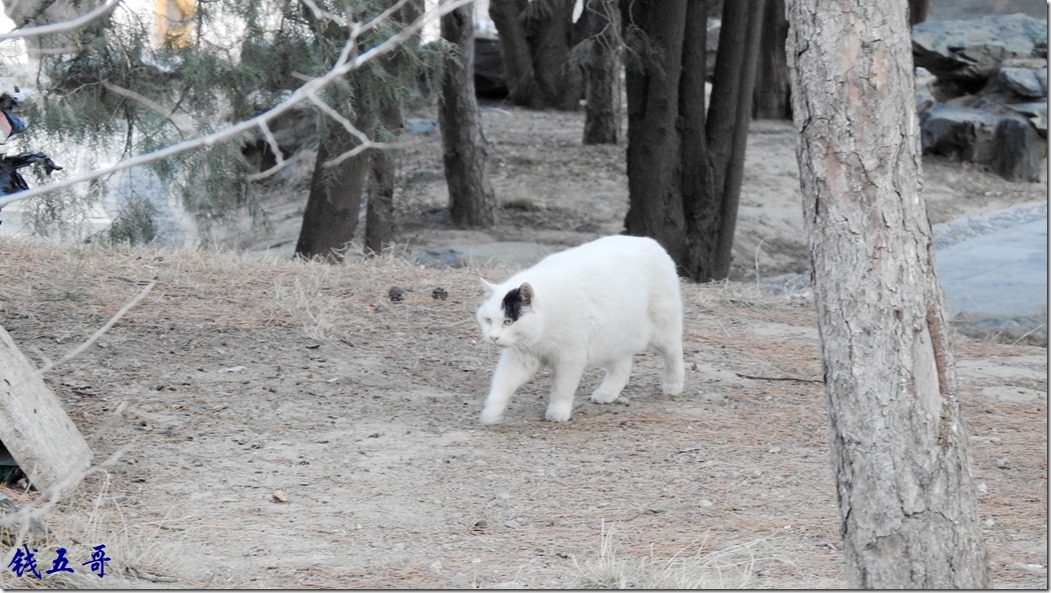 到了畅观堂喂猫点,沿着山路爬上去,一路晃动猫粮盒,没有看到猫,以为今天碰不到了。到山顶一看,原来双蓝眼和黑尾巴这次都从靠近湖的一侧爬上来,看来是在那边的保温箱中休息。两只猫看上去都圆滚滚的,毛色也很干净。在石头上倒上了一袋妙鲜包和一盒子皇家猫粮,两只猫认识我们,但是依然是小心翼翼。他们从灌木的一侧绕行过去,跳上石头开始吃午饭。两只猫都毫不犹豫地从妙鲜包开始,一颗一颗地舔食。然后才吃皇家猫粮。快吃完的时候,后面有两个游客走过,双蓝眼或者是有些紧张、或者是吃饱了,就转身离开了。留下单边继续埋头苦吃,直到几乎全部吃完,仅仅剩余了几粒猫粮。看来今天王姐还没有来,他们确实比较饿。两只猫离开后,一只黑喜鹊和一群灰喜鹊落下来吃剩饭。也就在十几秒之间,石头上面什么也不剩了~~在两只猫吃饭之时,把猫水盆中的冰倒掉,换上了纯净水。冬天,猫的饮水问题也很重要。